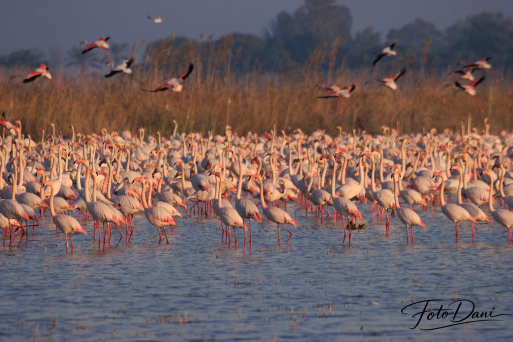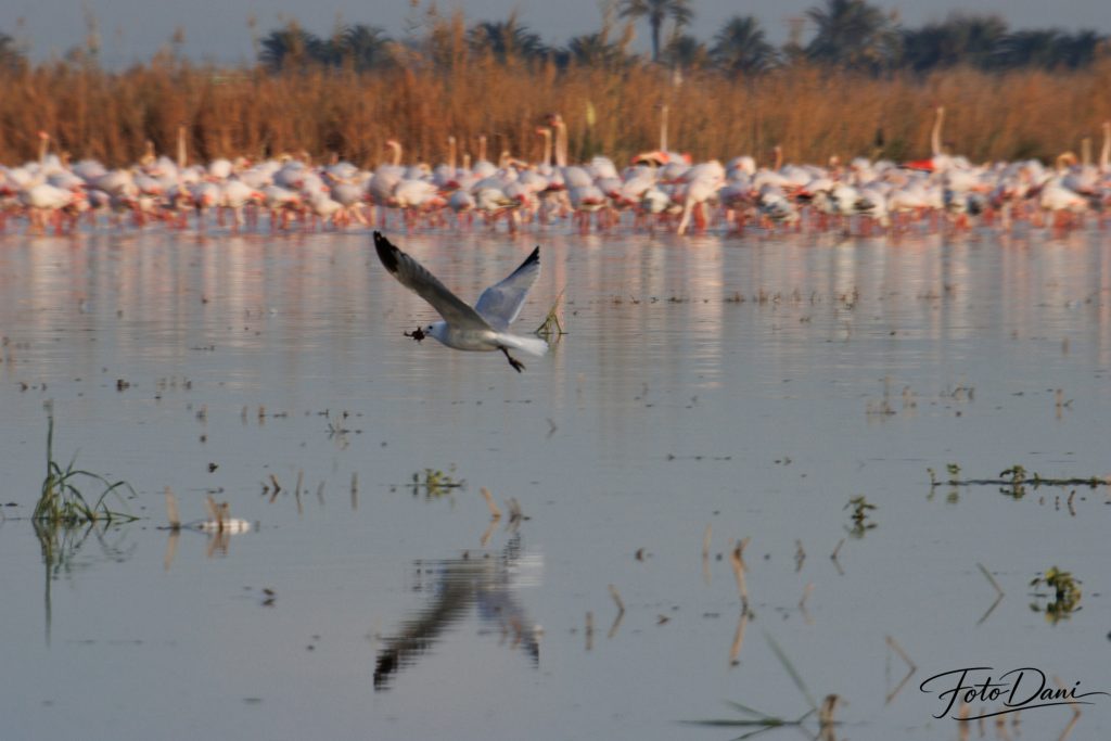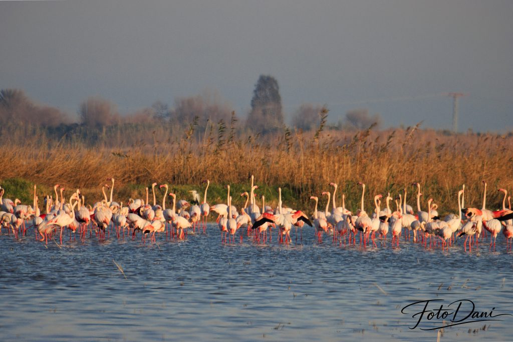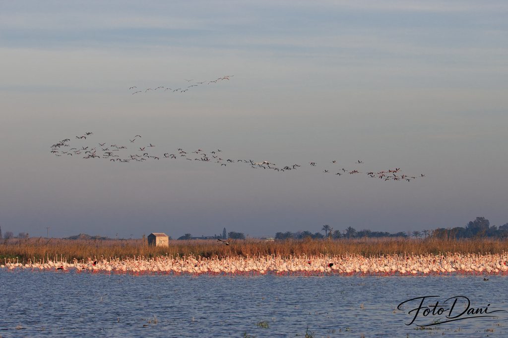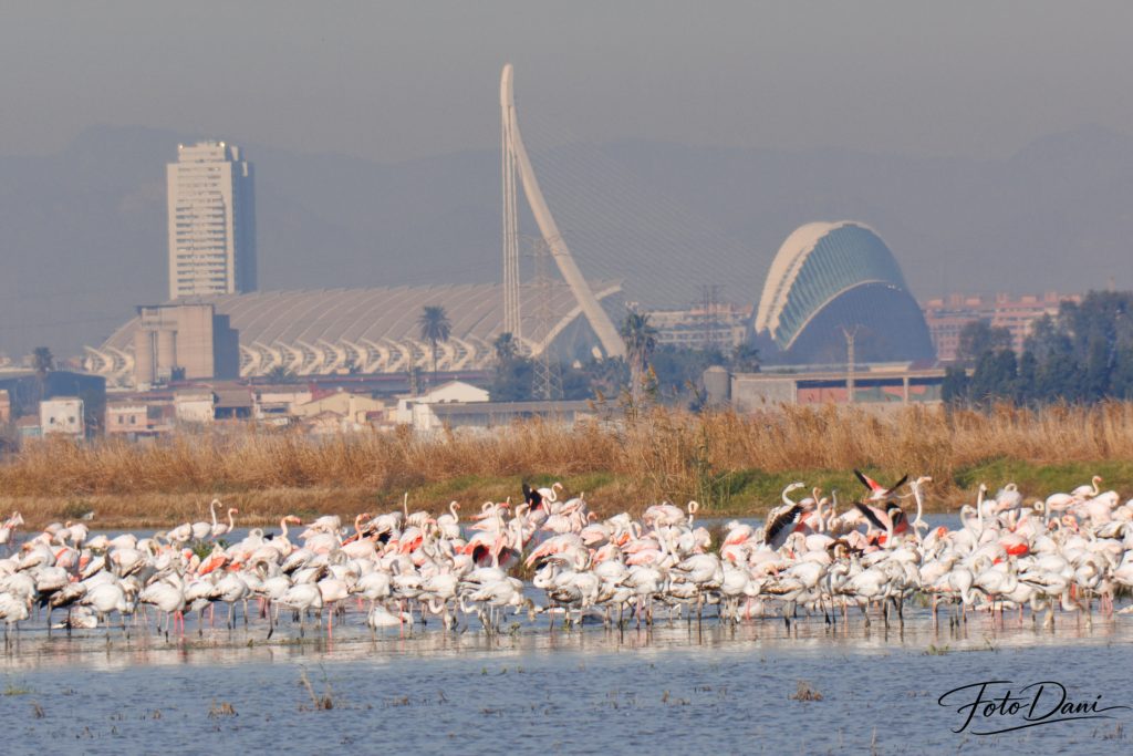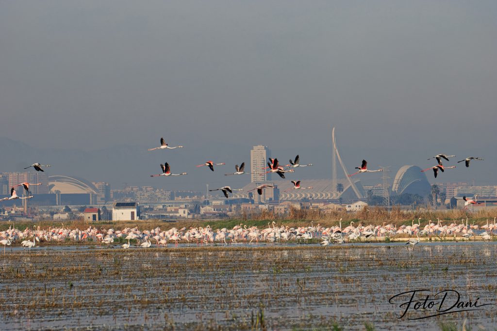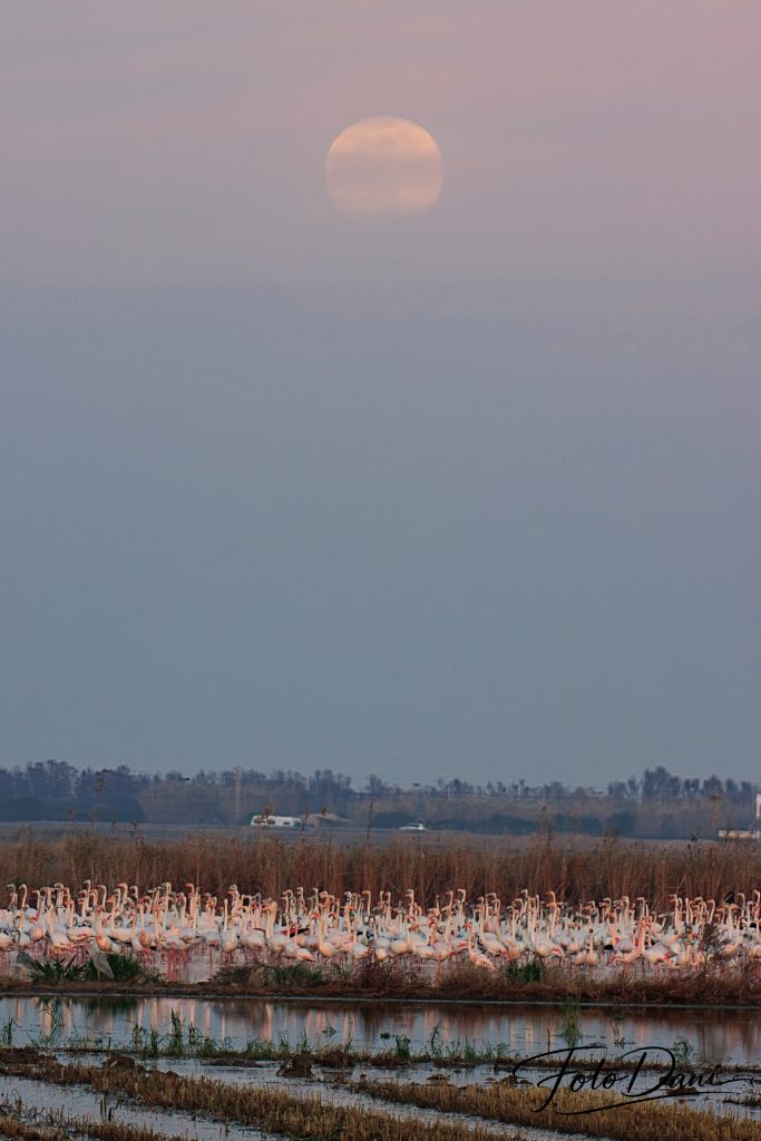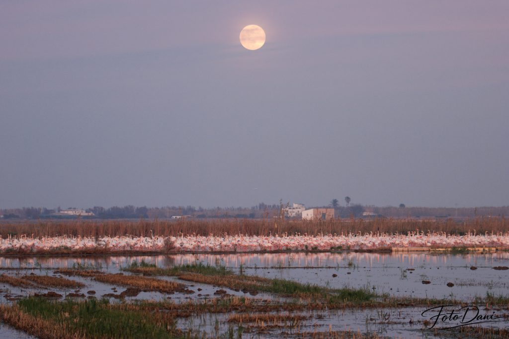 Cada año, los flamencos hacen una parada en Valencia, casi siempre en enero. Durante este periodo, descansan, vuelan un poco por los alrededores y se marchan cuando les apetece. Estos momentos ofrecen oportunidades perfectas para hacer fotos preciosas. Y si además sale la luna, tienes doble suerte.